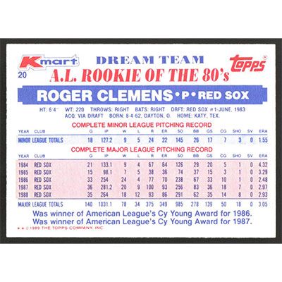This is a 1989 K-Mart Roger Clemens baseball card. The card is #20 and pictures show condition.