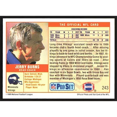 This is a 1989 Pro Set Jerry Burns football card. The card is #243 and pictures show condition.
