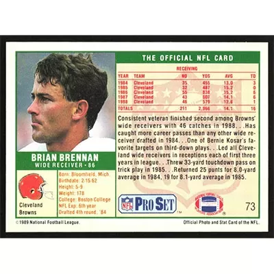 This is a 1989 Pro Set Brian Brennan football card. The card is #73 and pictures show condition.