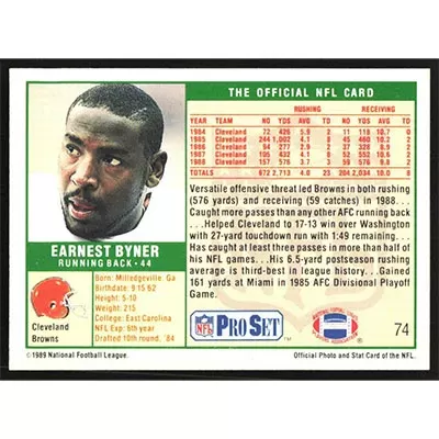 This is a 1989 Pro Set Earnest Byner football card. The card is #74 and pictures show condition.