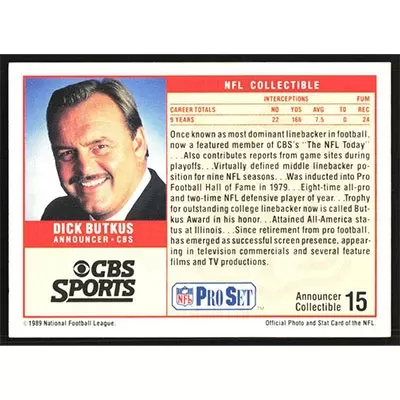 This is a 1989 Pro Set Announcers Dick Butkus football card. The card is #15 and pictures show condition.