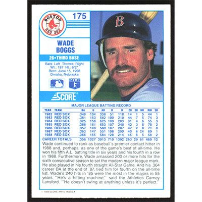This is a 1989 Score Wade Boggs baseball card. The card is #175 and pictures show condition.