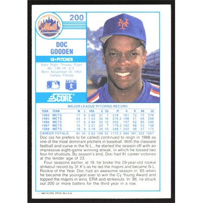 This is a 1989 Score Doc Gooden baseball card. The card is #200 and pictures show condition.