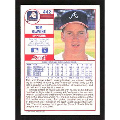 This is a 1989 Score Tom Glavine baseball card. The card is #442 and pictures show condition.