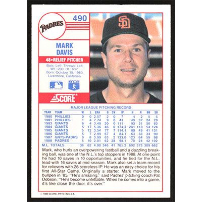 This is a 1989 Score Mark Davis baseball card. The card is #490 and pictures show condition.