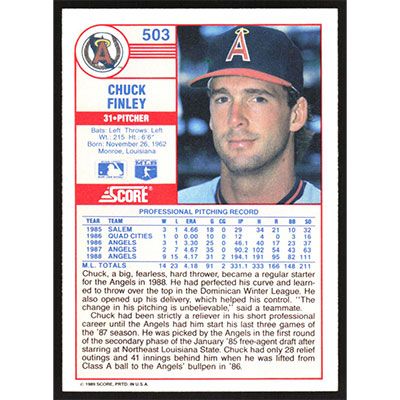 This is a 1989 Score Chuck Finley baseball card. The card is #503 and pictures show condition.