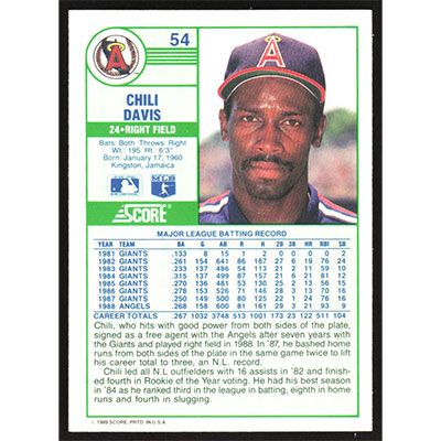 This is a 1989 Score Chili Davis baseball card. The card is #54 and pictures show condition.