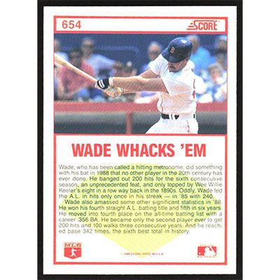 This is a 1989 Score Wade Boggs baseball card. The card is #654 and pictures show condition.