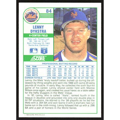 This is a 1989 Score Lenny Dykstra baseball card. The card is #84 and pictures show condition.