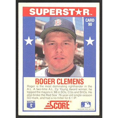 This is a 1989 Score Hottest 100 Stars Roger Clemens baseball card. The card is #90 and pictures show condition.