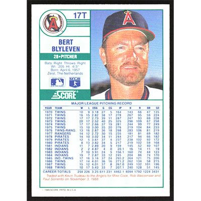 This is a 1989 Score Rookie/Traded Bert Blyleven baseball card. The card is #17T and pictures show condition.