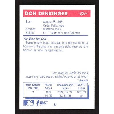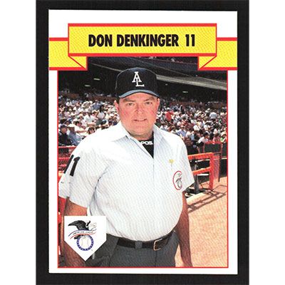 This is a 1989 T&M Sports Umpires Don Denkinger baseball card. The card is #6 and pictures show condition.