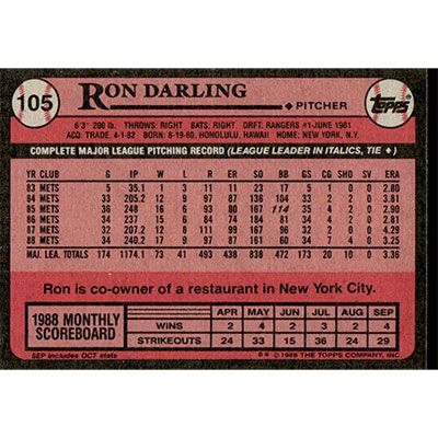 This is a 1989 Topps Ron Darling baseball card. The card is #105 and pictures show condition.
