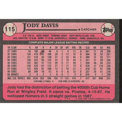This is a 1989 Topps Jody Davis baseball card. The card is #115 and pictures show condition.