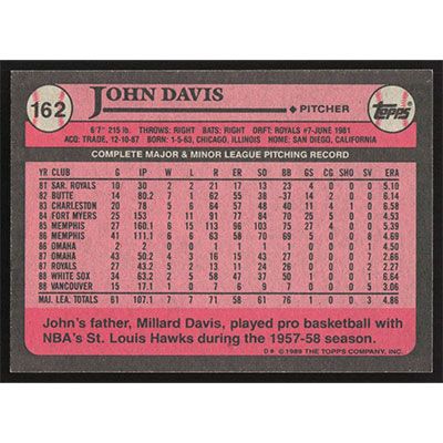 This is a 1989 Topps John Davis baseball card. The card is #162 and pictures show condition.
