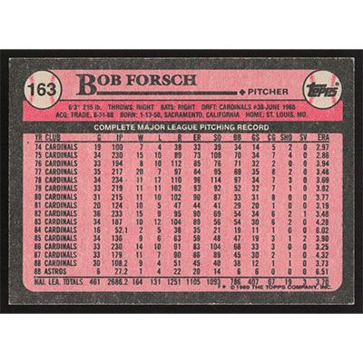 This is a 1989 Topps Bob Forsch baseball card. The card is #163 and pictures show condition.