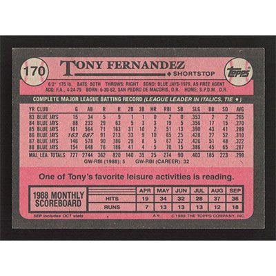 This is a 1989 Topps Tony Fernandez baseball card. The card is #170 and pictures show condition.