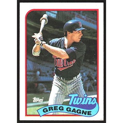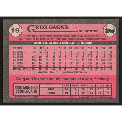 This is a 1989 Topps Greg Gagne baseball card. The card is #19 and pictures show condition.
