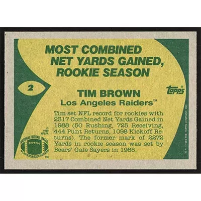 This is a 1989 Topps Tim Brown Record Breaker football card. The card is #2 and pictures show condition.