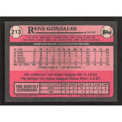 This is a 1989 Topps Rene Gonzales baseball card. The card is #213 and pictures show condition.