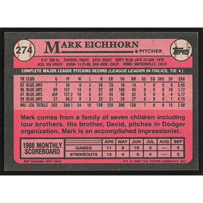 This is a 1989 Topps Mark Eichhorn baseball card. The card is #274 and pictures show condition.