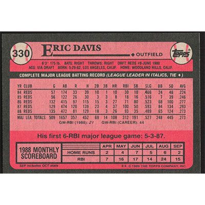 This is a 1989 Topps Eric Davis baseball card. The card is #330 and pictures show condition.