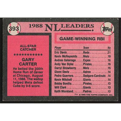 This is a 1989 Topps Gary Carter All-Star baseball card. The card is #393 and pictures show condition.