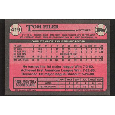 This is a 1989 Topps Tom Filer baseball card. The card is #419 and pictures show condition.