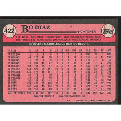 This is a 1989 Topps Bo Diaz baseball card. The card is #422 and pictures show condition.