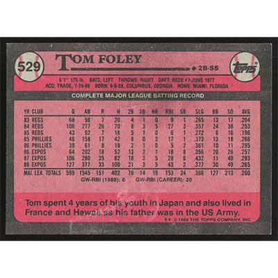 This is a 1989 Topps Tom Foley baseball card. The card is #529 and pictures show condition.