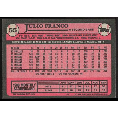 This is a 1989 Topps Julio Franco baseball card. The card is #55 and pictures show condition.
