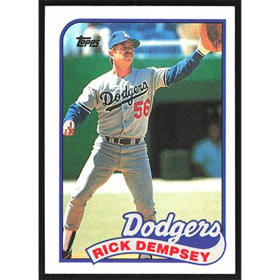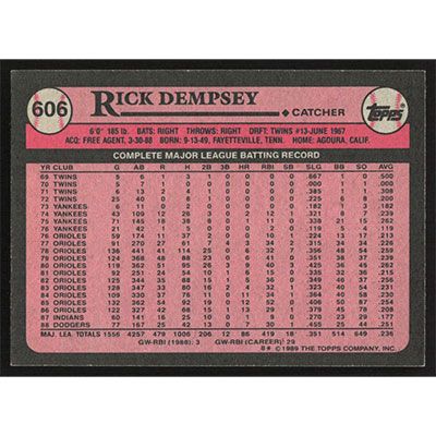 This is a 1989 Topps Rick Dempsey baseball card. The card is #606 and pictures show condition.