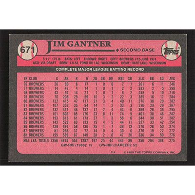 This is a 1989 Topps Jim Gantner baseball card. The card is #671 and pictures show condition.
