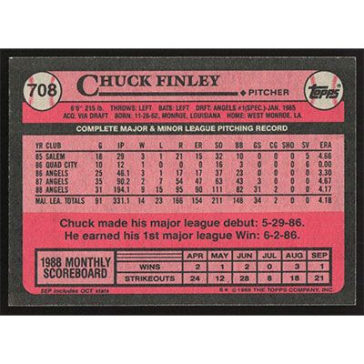This is a 1989 Topps Chuck Finley baseball card. The card is #708 and pictures show condition.