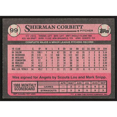 This is a 1989 Topps Sherman Corbett baseball card. The card is #99 and pictures show condition.