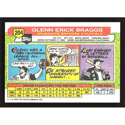 This is a 1989 Topps Big Glenn Braggs baseball card. The card is #204 and pictures show condition.
