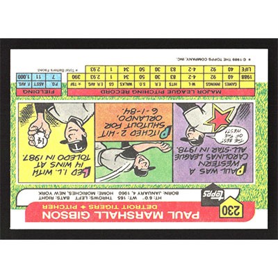 This is a 1989 Topps Big Paul Gibson baseball card. The card is #230 and pictures show condition.