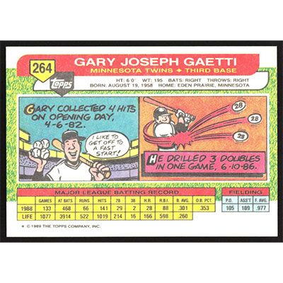 This is a 1989 Topps Big Gary Gaetti baseball card. The card is #264 and pictures show condition.