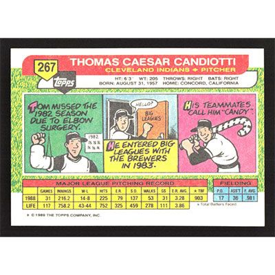This is a 1989 Topps Big Tom Candiotti baseball card. The card is #267 and pictures show condition.