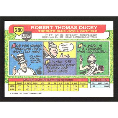 This is a 1989 Topps Big Rob Ducey baseball card. The card is #280 and pictures show condition.