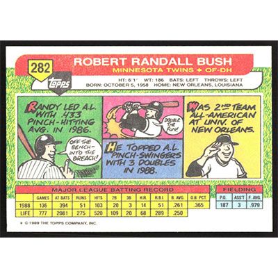 This is a 1989 Topps Big Randy Bush baseball card. The card is #282 and pictures show condition.