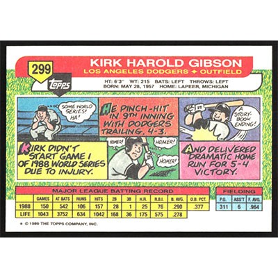 This is a 1989 Topps Big Kirk Gibson baseball card. The card is #299 and pictures show condition.