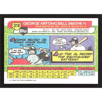 This is a 1989 Topps Big George Bell baseball card. The card is #318 and pictures show condition.