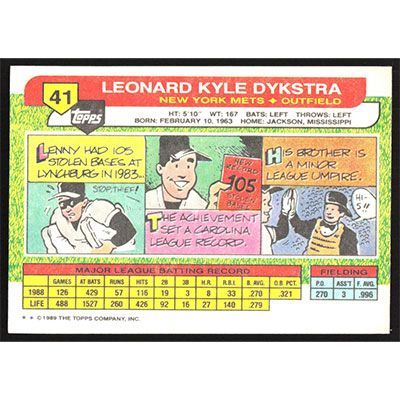 This is a 1989 Topps Big Len Dykstra baseball card. The card is #41 and pictures show condition.