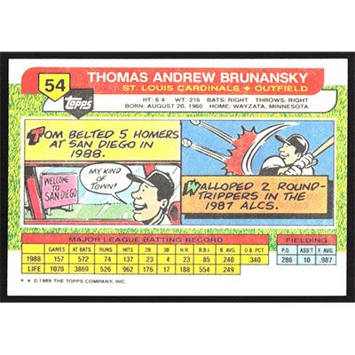 This is a 1989 Topps Big Tom Brunansky baseball card. The card is #54 and pictures show condition.