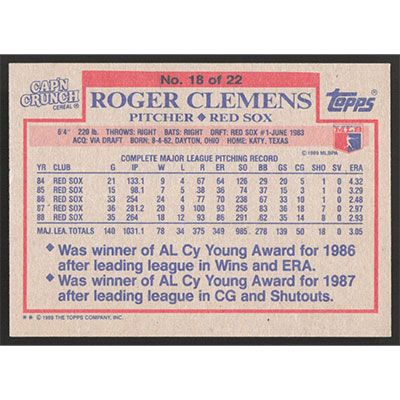 This is a 1989 Topps Cap'n Crunch Roger Clemens baseball card. The card is #18 and pictures show condition.
