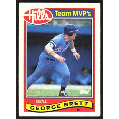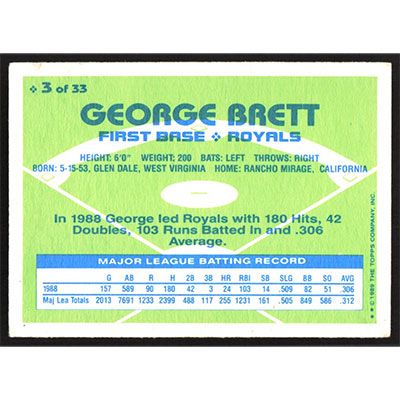 This is a 1989 Topps Hills Team MVPs George Brett baseball card. The card is #3 and pictures show condition.