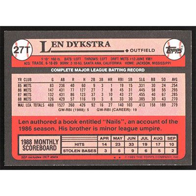 This is a 1989 Topps Traded Len Dykstra baseball card. The card is #27T and pictures show condition.