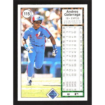 This is a 1989 Upper Deck Andres Galarraga baseball card. The card is #115 and pictures show condition.