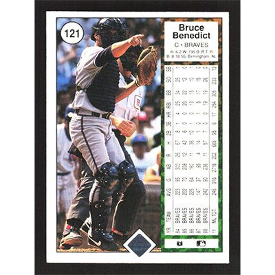 This is a 1989 Upper Deck Bruce Benedict baseball card. The card is #121 and pictures show condition.